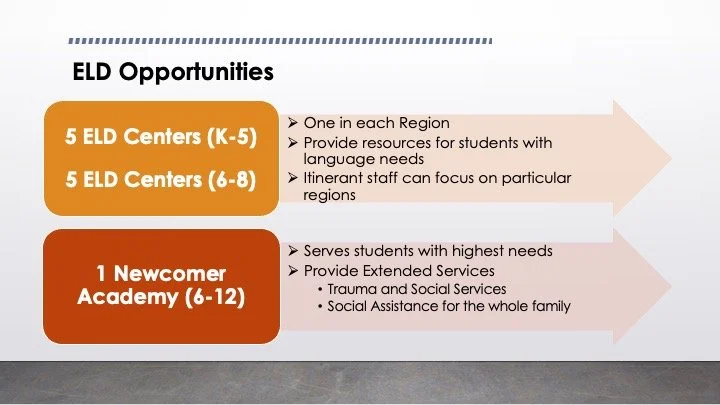 We propose having one ELD focused school in each region, for each grade configuration level (Elementary, Middle, and High school). These would offer slightly higher support structures in place for our ELL students. Ideally, these schools would be located in areas of the city with higher concentrations of ELL students for ease of access/transportation.