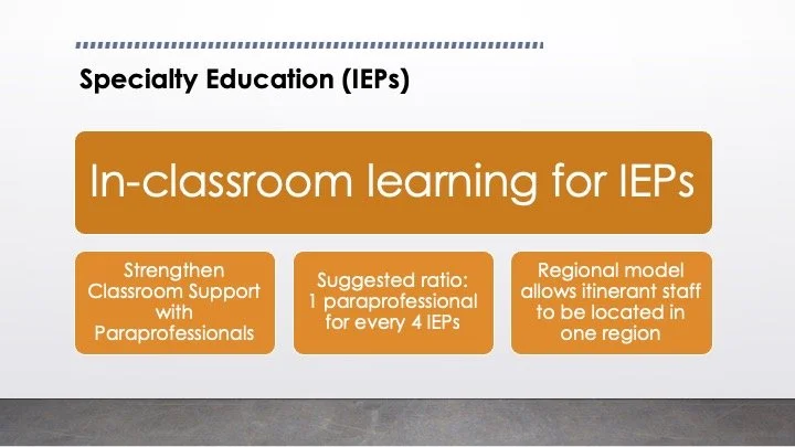 Our teachers are already overburdened, so this will require additional paraprofessional support. We propose 1 paraprofessional for every 4 IEP students in a classroom. Keeping class sizes smaller is also very important to a dynamic and thriving learning environment. These investments are critical to the success of all of our students, as well as the morale, retention, and attraction of new, diverse, great teachers.